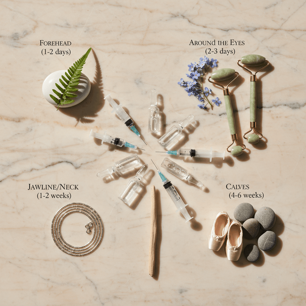 ボトックス注射の効果が現れるまでの期間を部位別に解説。個人差があるため、医師にご確認ください。
